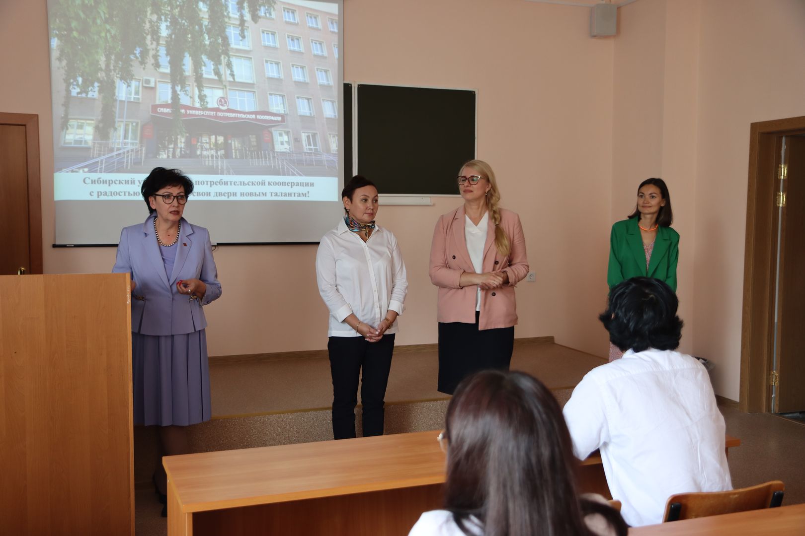 Приветственное слово первокурсникам адресовали ректор университета, профессор Валентина Бакайтис и проректор по учебной работе, доцент Лина Ватлина. Поздравить студентов пришли министр промышленности, торговли и развития предпринимательства Новосибирской области Андрей Гончаров; первый заместитель мэра Новосибирска Геннадий Захаров; начальник профильного для университета департамента инвестиций, потребительского рынка, инноваций и предпринимательства мэрии Новосибирска Виталий Витухин; глава администрации Ленинского района Новосибирска Александр Гриб, председатель правления Новосибирского облпотребсоюза Сергей Сапсай, заместитель председателя правления Новосибирского облпотребсоюза Александр Евсюков, председатель Новосибирской Федерации СБЕ «ММА» Юрий Фоломкин, заместитель директора ГБУ НСО «Агентство поддержки молодежных инициатив» Екатерина Фидирко и другие почетные гости. Так же слова приветствия в адрес первокурсников прозвучали в этот день от представителей регионального отделения Сбербанка России.