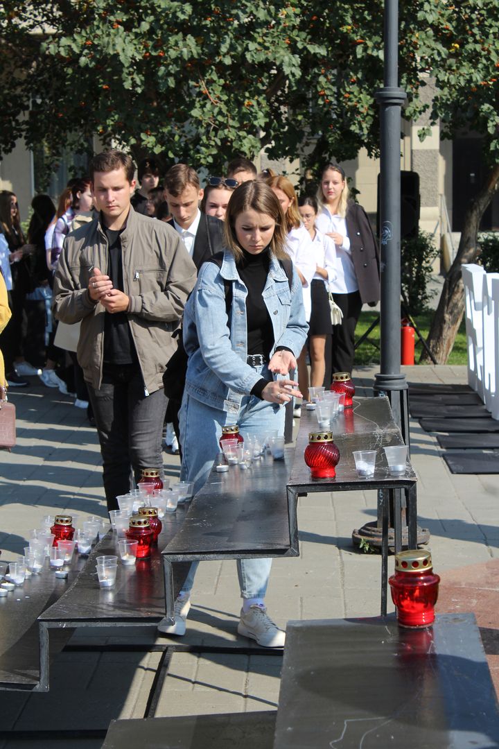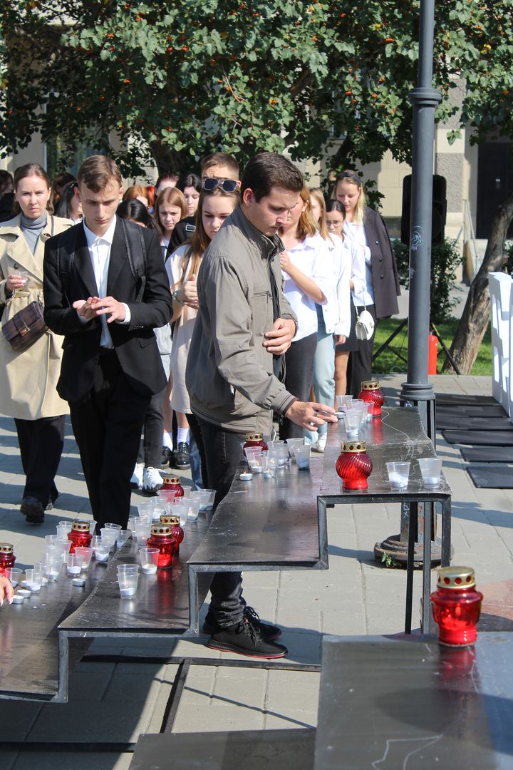 3 сентября сотни жителей Новосибирска присоединились к акциям: «Свеча памяти» и «Помним Беслан», проводимых на площади Пименова. Студенты Сибирского университета потребительской кооперации также приняли участие в этих мероприятиях. Они почтили память погибших минутой молчания, зажгли свечи и запустили в небо белые воздушные шары по числу жертв трагедии.