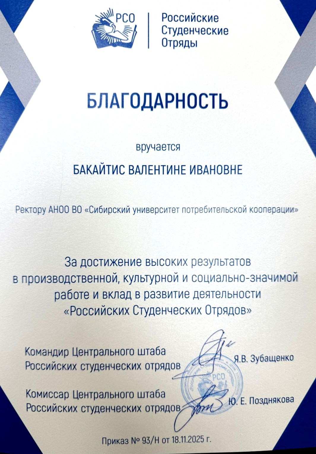 Сибирский университет потребительской кооперации (СибУПК) отмечен Благодарственным письмом НРО МООО «Российский студенческие отряды» за активное сотрудничество и поддержку студенческих отрядов в регионе.